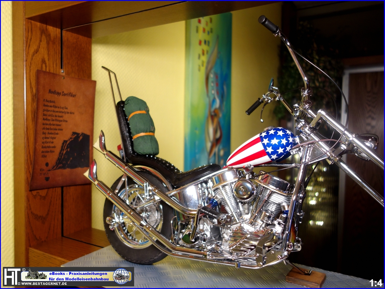 Wie bereits angekündigt, ist es jetzt soweit. Ich zeige hier die Baudokumentation der Harley Davidson (Captain America) im grandiosen Maßstab 1:4 aus dem Kultfilm