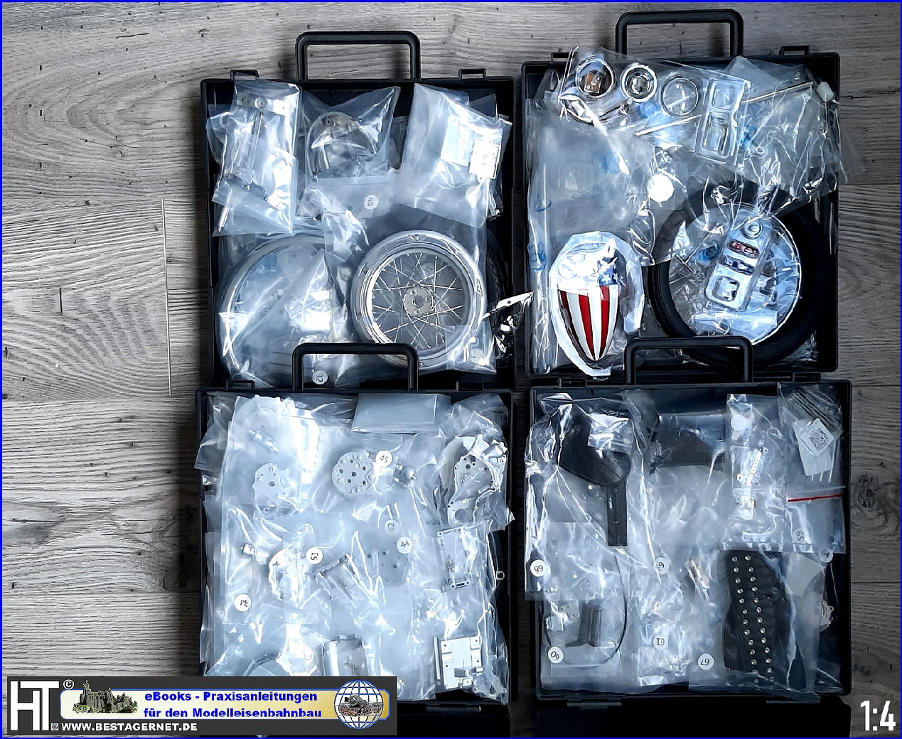 Vier Kisten voller Bauteile, viele davon aus Metall, warten darauf zu einem Kultmotorrad zusammengeschraubt zu werden.